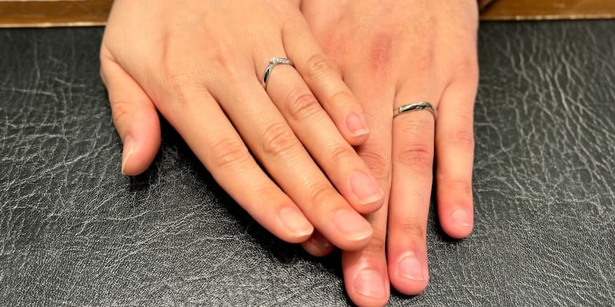 「ことのは」から男性様はウェーブ、女性様はストレートのフォルムをお選びいただきました。ペア感がありつつもそれぞれにしっくりくるデザインの組み合わせに。