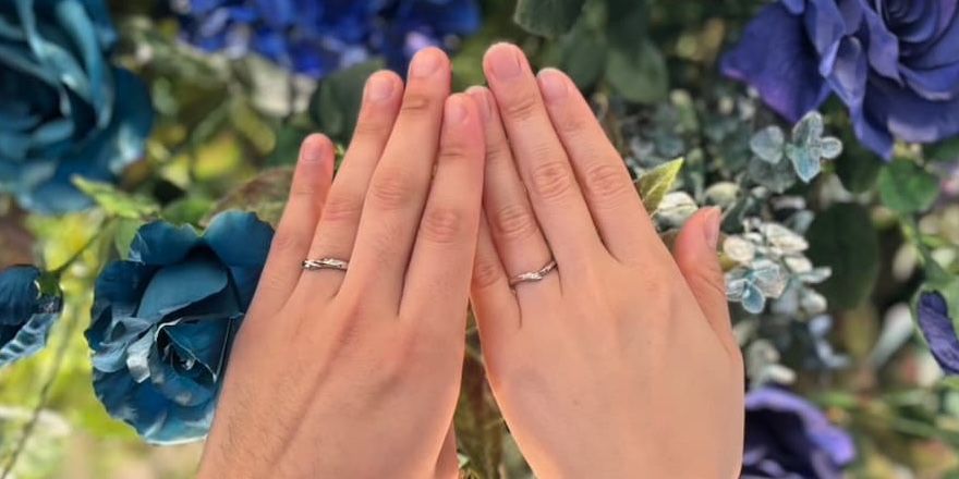 女性様はしなやかなラインが魅力的な婚約指輪「ことのは」と結婚指輪「初桜」をお選びいただきました。