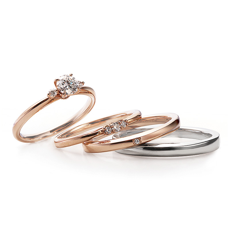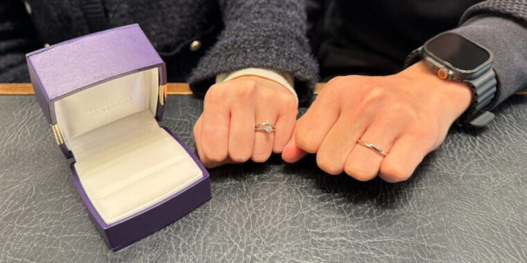 女性様はしなやかなラインが魅力的な婚約指輪「ことのは」と結婚指輪「初桜」をお選びいただきました。