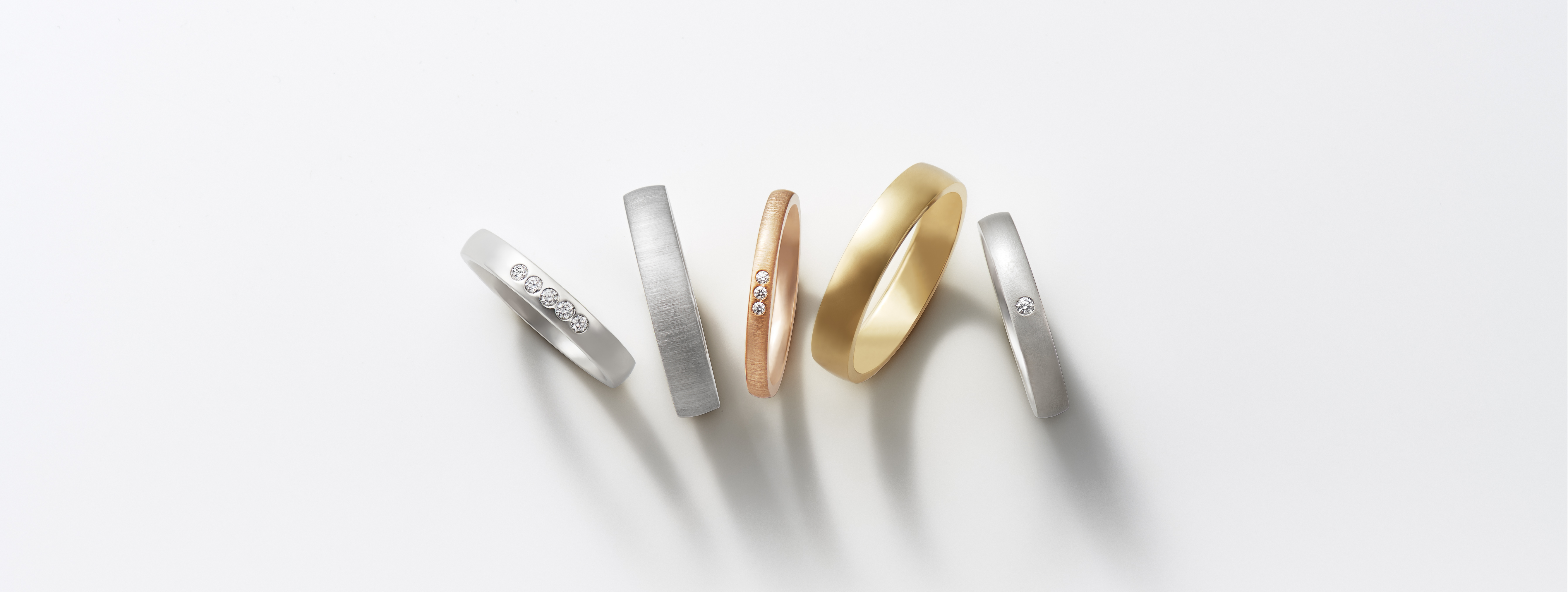 今回お選びいただいたペアの結婚指輪は幅や素材、表面仕上げ、ダイヤモンドの数をおふたり仕様にカスタムすることができるシリーズです。上品なプラチナに、幅はそれぞれの指に合わせて2.0㎜と2.5㎜。
