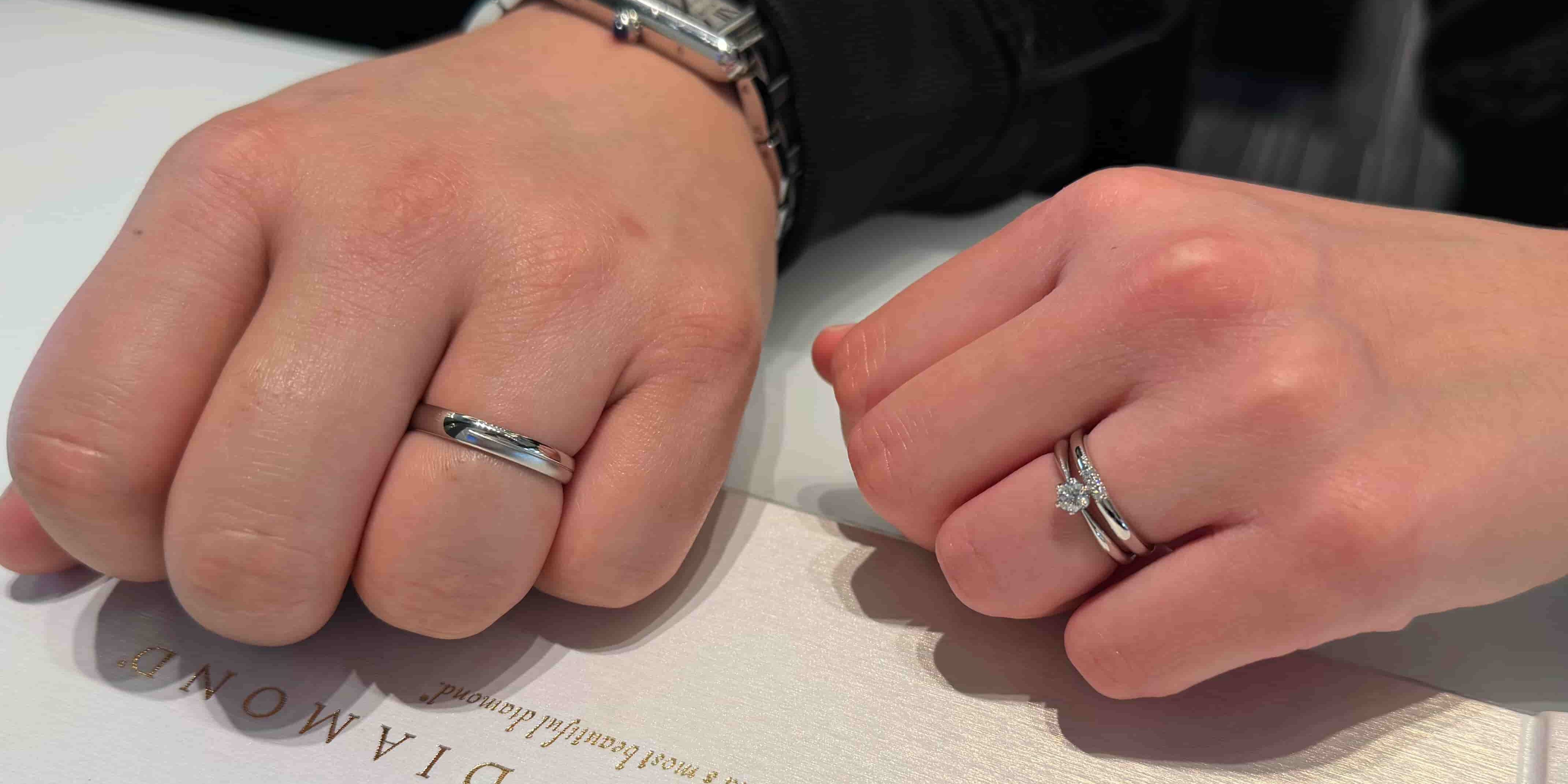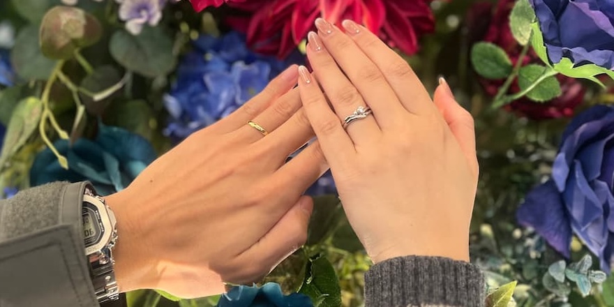 結婚指輪は「茜雲」「凛」。おふたりの手元に似合うデザインで、側面のダイヤモンドでペア感を演出。男性様もダイヤありでお作りし、輝きがとてもお似合いでした!