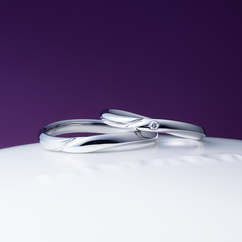 今回お選びいただいたモデルは、幅太で磨き分けのコントラストが唯一無二の印象を持つ「風神」と、やわらかなウェーブラインにダイヤ1石をセッティングした「あかり」