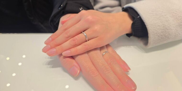 NIWAKAの結婚指輪「せせらぎ」を選んでくださったおふたり。男性様がサプライズでご用意くださった、おなじNIWAKAの婚約指輪「木洩日」にぴったりと重なるリングです。