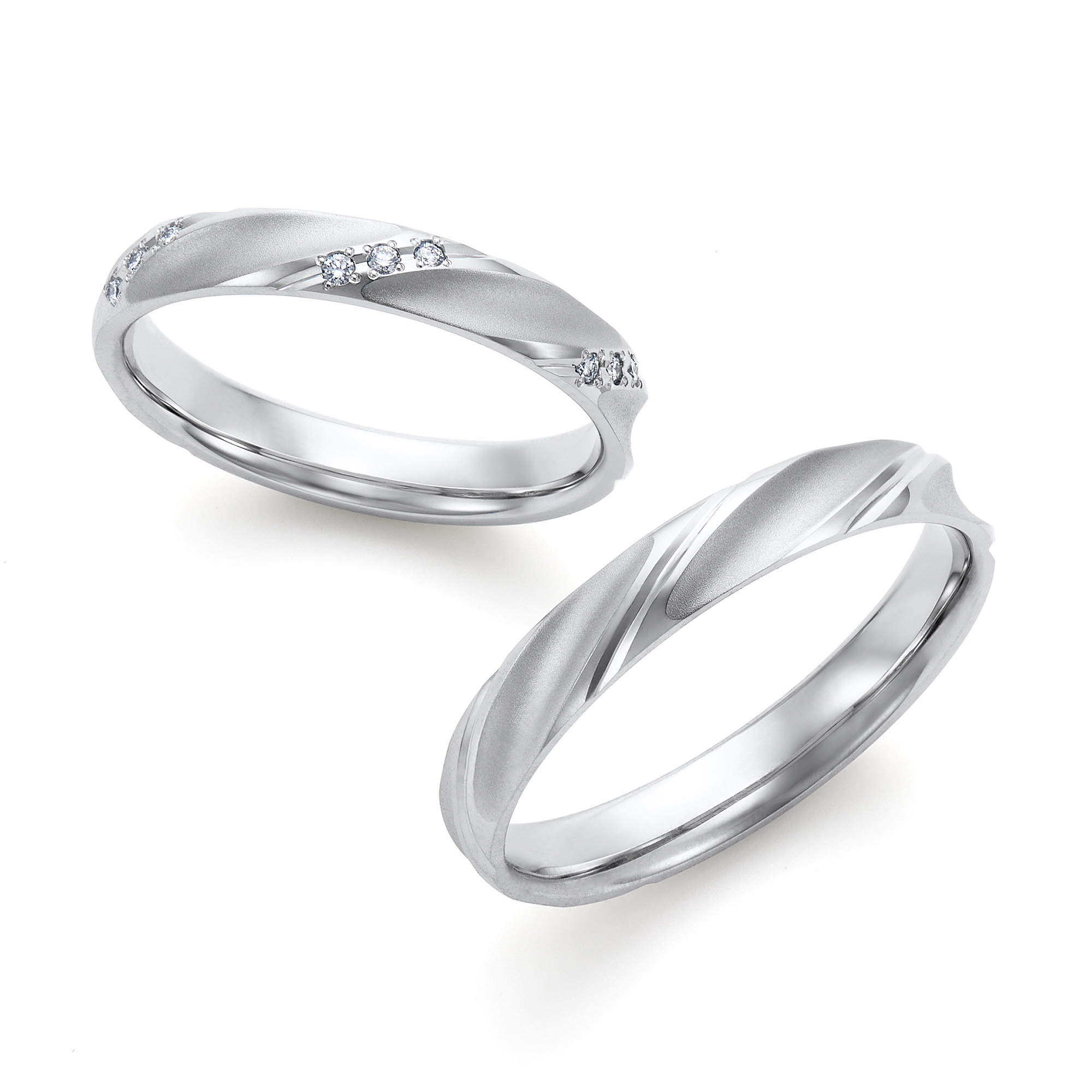 ご主人様は2色のコンビネーションと磨き分けがおしゃれなデザイン。奥様はリボンのように中央が絞られたフォルムにダイヤモンドがきらめくデザインに。