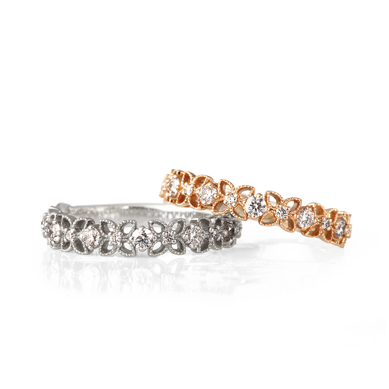 花びらを表現した透かし彫りに細かなミル打ちが施され、繊細で可愛らしいデザインです。