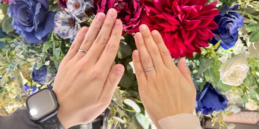 お選びいただいた「ヴァニーユ」は、ふっくらとしたフォルムとV字ラインの結婚指輪。メレダイヤモンドを贅沢に施したデザインは、指元をエレガントに。甘く優しく広がるバニラの香りのように、ふたりの時を重ねる姿をイメージしています。ダイヤなしのデザインは、部分マットでシャープな印象に。数あるブランドの中から悩みながらお選びいただきました。優しくおだやかなおふたりにとてもお似合いでした!