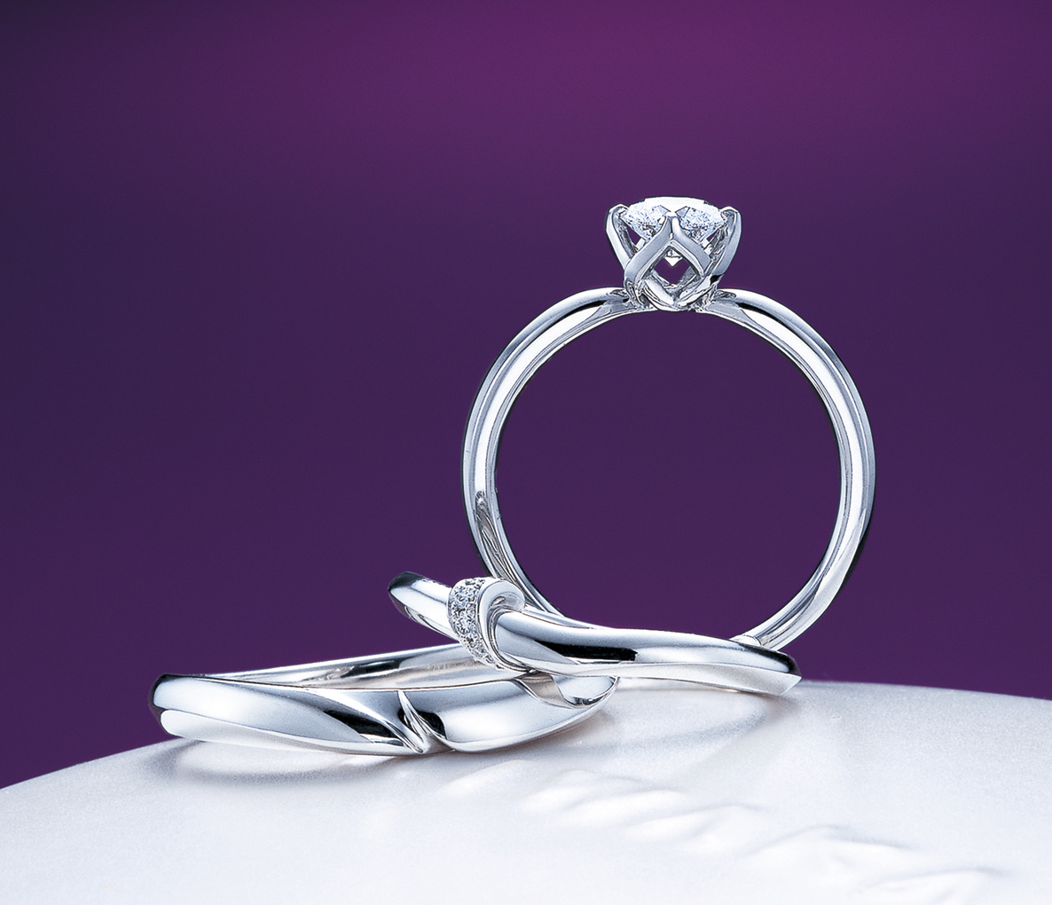 おふたりの固い絆を「結び」で表現しているデザインで、爪や石座がダイヤモンドを優しく包みこみます。