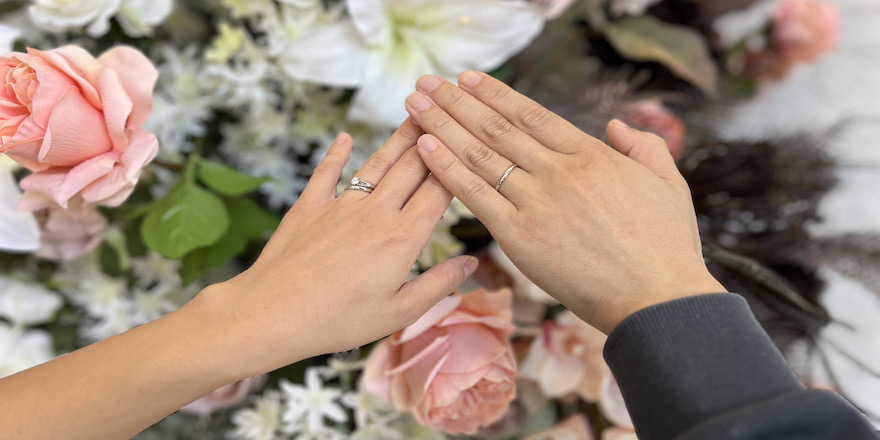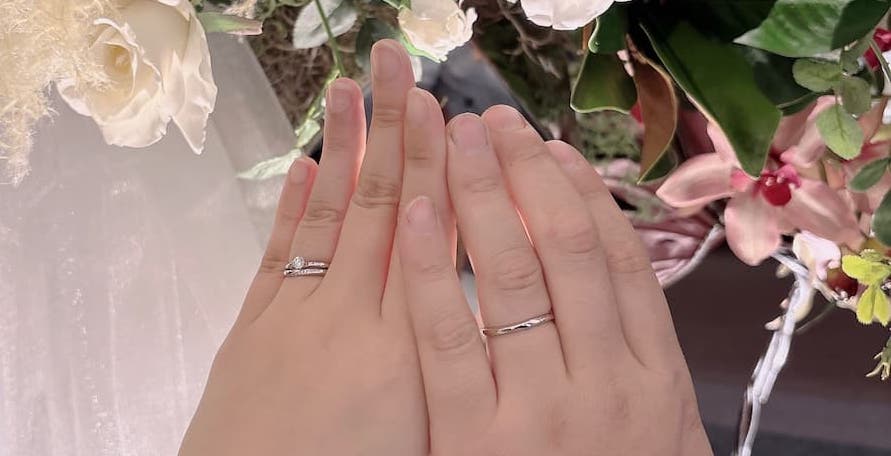 NIWAKAの結婚指輪「せせらぎ」を選んでくださったおふたり。男性様がサプライズでご用意くださった、おなじNIWAKAの婚約指輪「木洩日」にぴったりと重なるリングです。