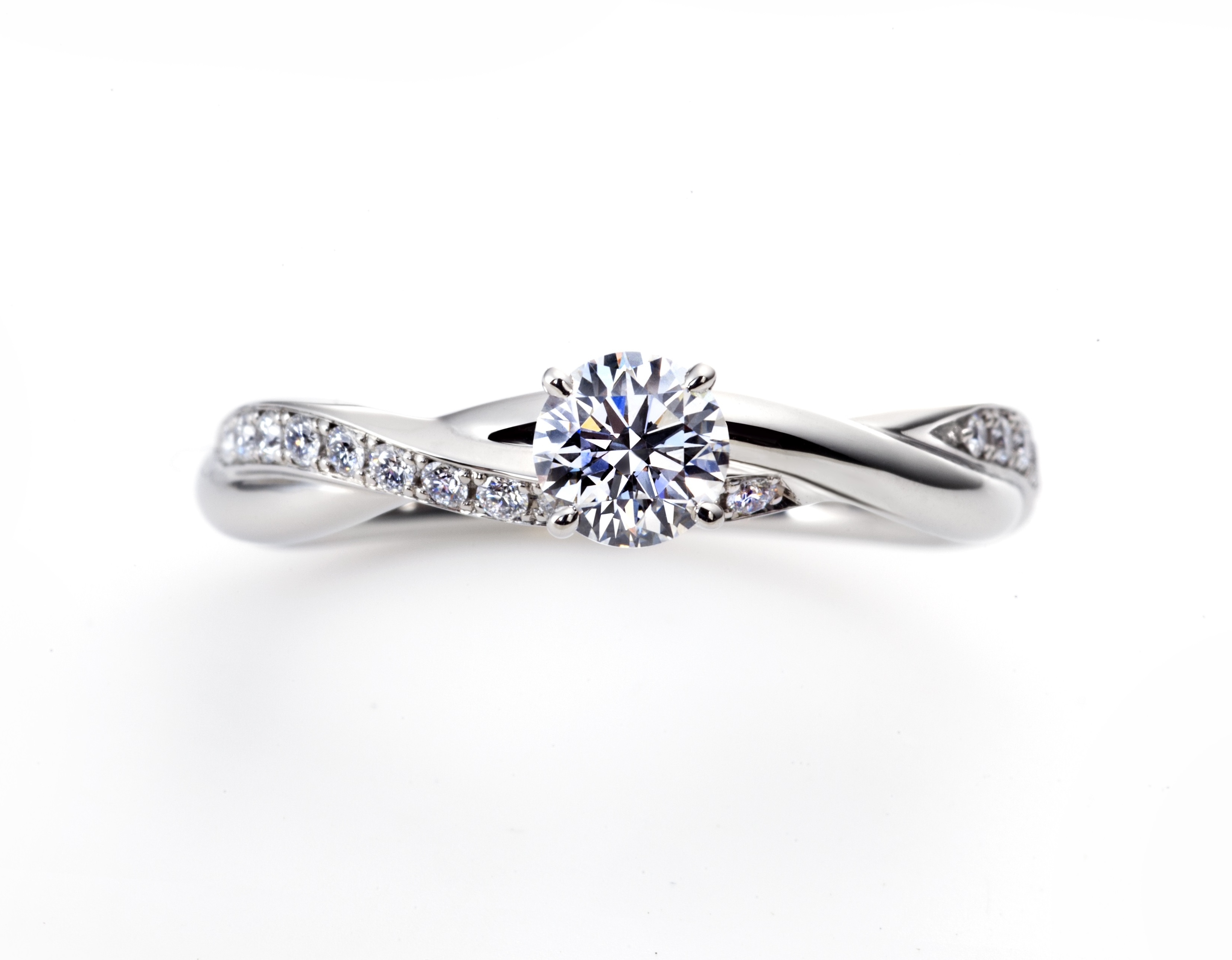 露華はやわらかいウェーブデザインにサイドにあしらわれたメレダイヤモンドが輝きを添える上品な婚約指輪です。