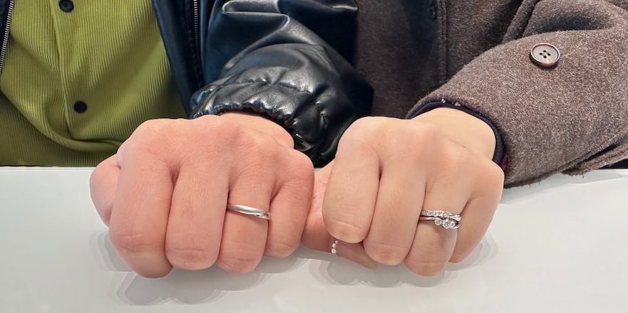 女性様はダイヤモンドが並び、上品かつ華やかさも楽しめるデザインに、男性様は太めの幅に半分ずつ鏡面とヘアライン加工が施されたスタイリッシュなデザインに仕上がりました。