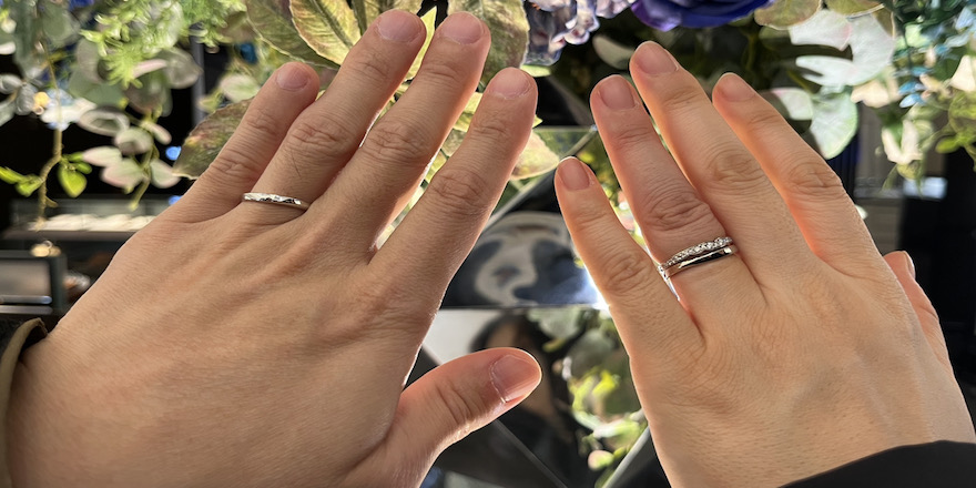 ダイヤモンドがないデザインのため、おふたりで全く同じデザインの結婚指輪を着けていただけます。