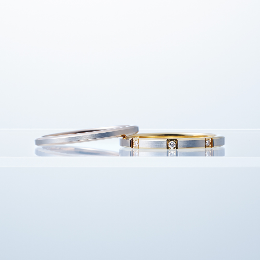 おふたりにお選びいただいた「ハーモニー」は、プラチナとイエローゴールドのコンビのデザイン。ダイヤモンドが等間隔に3石留められており、存在感がありながらすっきりと洗練された印象に。細身な幅でありながら、縁から覗くゴールドがスタイリッシュで、おしゃれなおふたりにとてもお似合いでした!