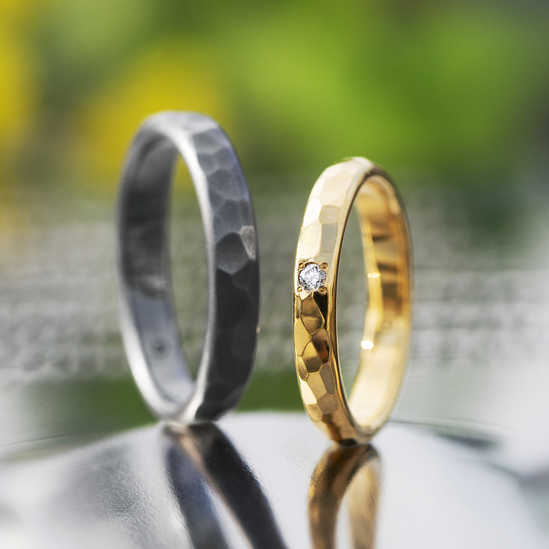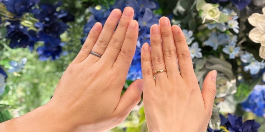 結婚指輪「アイナ」は丸みのある形状と表面のつちめ模様が特徴的。マットとツヤで全く異なる表情を楽しめるのも魅力です。男性様は最も黒い素材であるタンタル、女性様は華やかな色味が美しいオレンジゴールドでオーダー。普段お召しのジュエリーとのコーディネートも素敵でおふたりにとてもよくお似合いでございました。