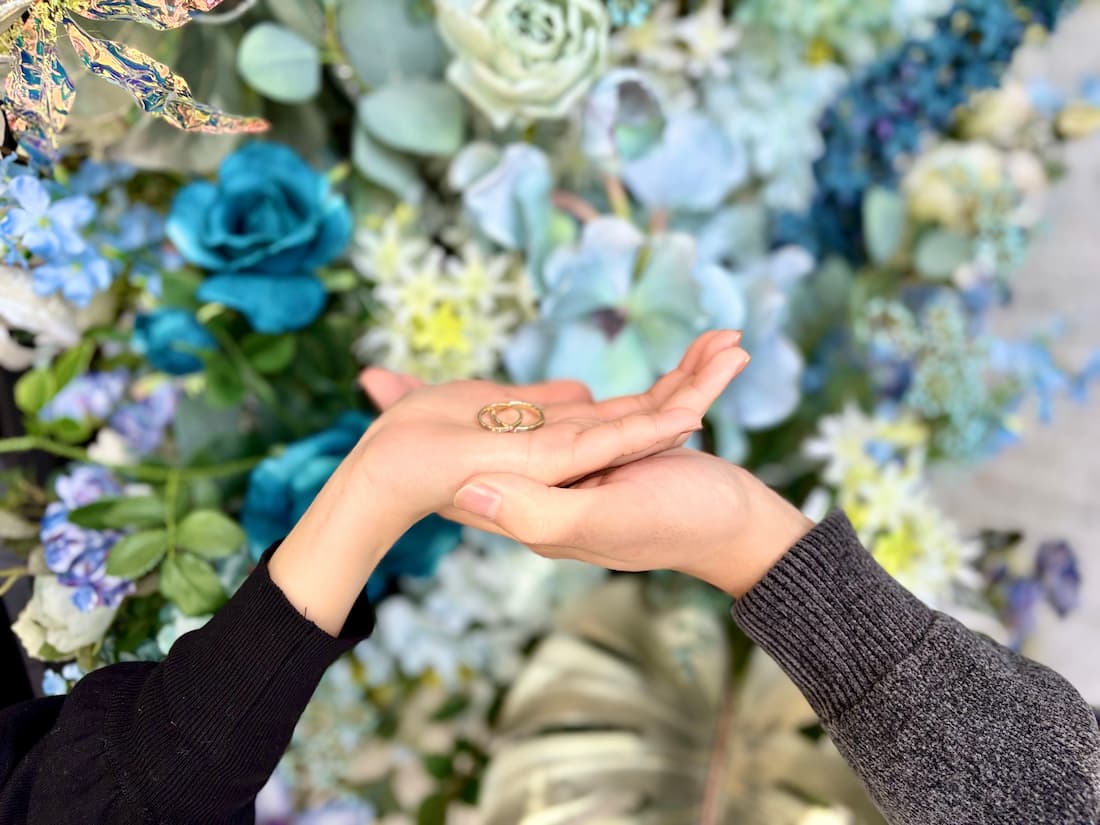 NIWAKAの婚約指輪・結婚指輪の「白鈴」を選んでくださったおふたり。重ねづけしたリングがとっても綺麗でしたね。