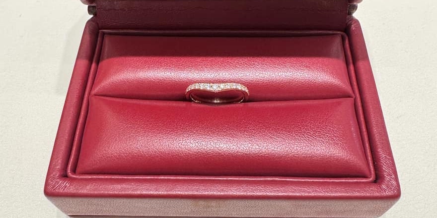 今回選ばれたのは指をすらっと美しく演出するV字ラインの結婚指輪です。上質なダイヤモンドがたっぷり敷きつめられたエレガントさが魅力。