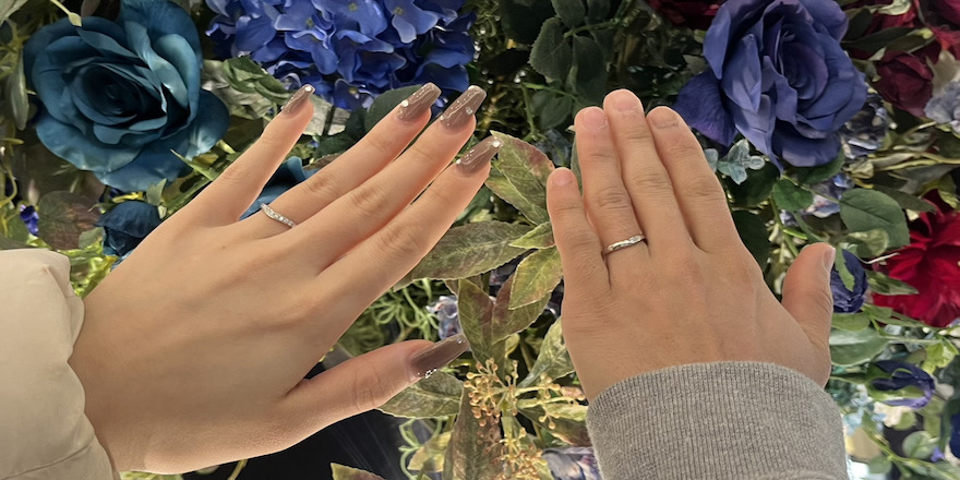 男性様のV字リングは結婚指輪らしい存在感があり、ペア感も抜群でしたね。