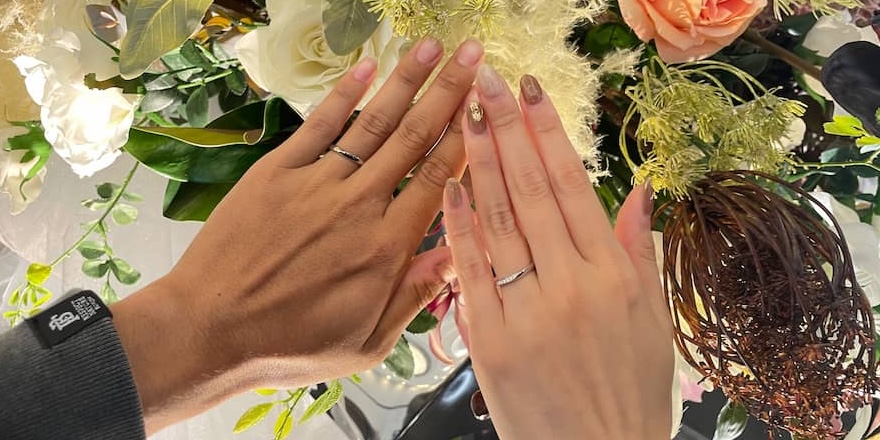 指を綺麗に見せてくれる緩やかなV字ラインがしなやかで、ペア感のあるお揃いのデザインはとても素敵な仕上がりでしたね。