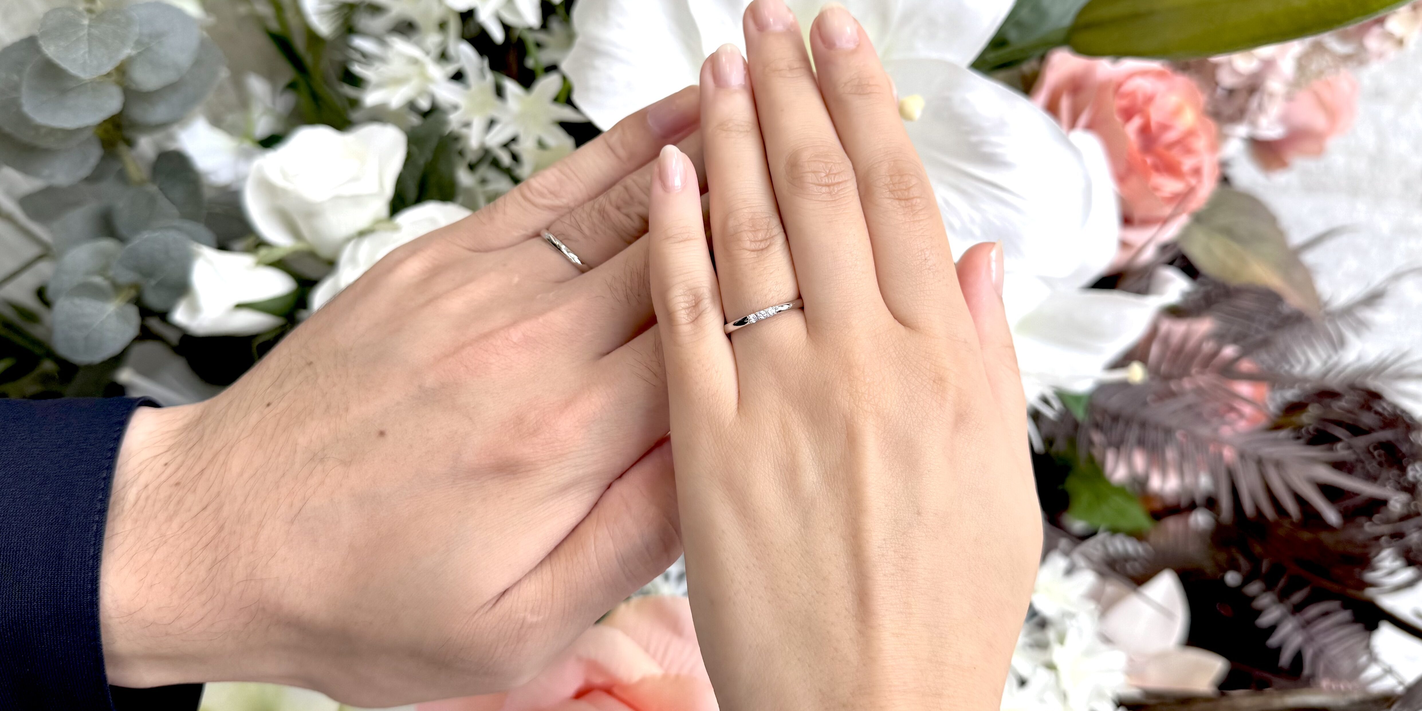 ご主人様は自然と手に馴染むウェーブのデザイン、奥様は結婚指輪らしいシンプルさが魅力のストレートのデザインをお選びいただきました。婚約指輪とブランドを揃えたことで、ダイヤモンドの輝きやリングの形状もぴったり合い、素敵な重ね着けに。