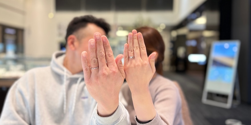 婚約指輪と同じく一石のデザインだからこそ、ダイヤモンドの美しさが際立っておりとてもお似合いでした。