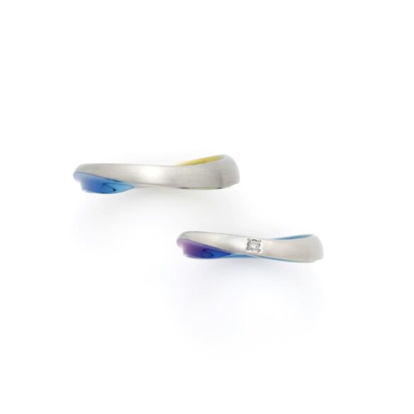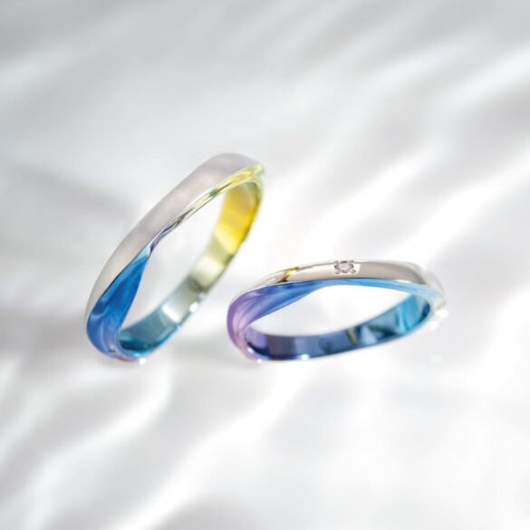 波がうねる様子をダイナミックで変化のあるフォルムで表現。着ける向きによって、色の見え方や形の印象が変わり、SORAならではの発色やデザイン性が堪能できるデザインです。
