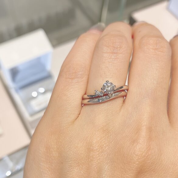 ウェーブラインとフェミニンな雰囲気の中に、優しく爽やかなアイスブルーダイヤモンドが可愛らしいデザイン。
