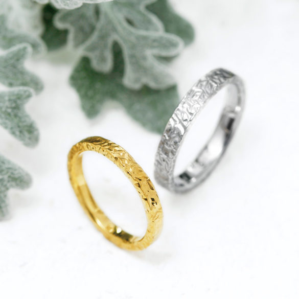 「お互いの想いを噛み締める」というコンセプトを持ち、奥歯で噛んだようなユニークなテクスチャーが他にはない唯一無二のデザイン。クラフト感のある表面が、素材による雰囲気の違いもお楽しみいただけます。