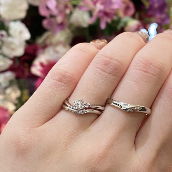 ウェーブデザインで緩やかに伸びるバラのつるを表現。センターダイヤモンドに巻き付くつるのように爪が留められています。中央に向かうにつれて細くなるアームでダイヤモンドがより大きく華やかに引き立ちます。