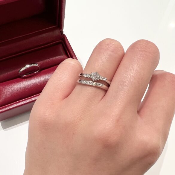 センターダイヤモンドの美しさを際立たせながら4石のメレダイヤモンドが輝きを放ちます。ゆるやかなウェーブラインは手元に良く馴染み、女性の美しさを引き立てます。