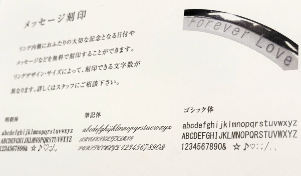 リングの内側にふたりの大切な記念日やメッセージ、名前のイニシャルを刻印することができます。外からは見えず、ふたりにしかわからない部分への刻印は特別感が増しますね。