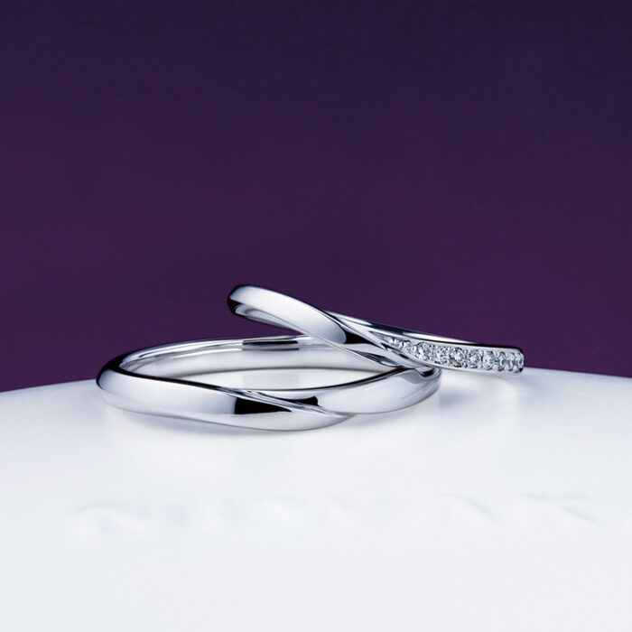 ふたりが手を取り合う姿が左右から伸びるラインで表現されています。程よい幅感と彫りのラインがさりげない個性を演出。