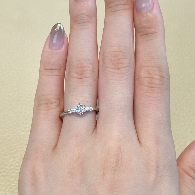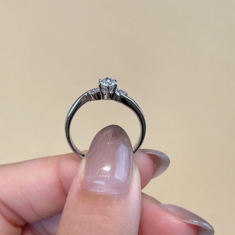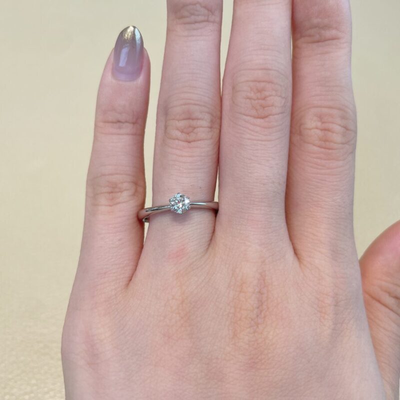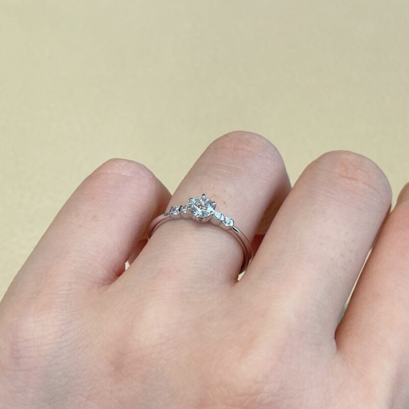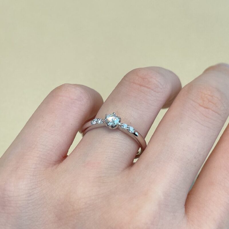ダイヤモンドが高く持ち上げられているため、結婚指輪との重ね着けがしやすく今後の楽しみが広がります。