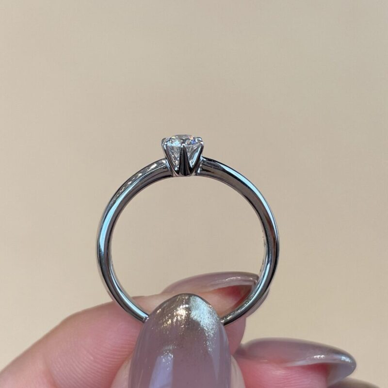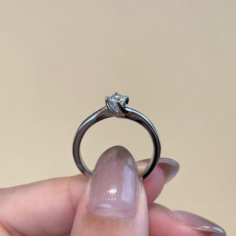 婚約指輪らしさのある1石ストレート。注目すべきはその横顔です。ダイヤモンドを支えるように紐を結わえたような繊細なデザインになっています。