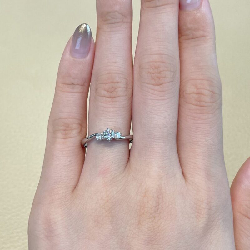 大人気の3石デザイン。「幸福が訪れる」という花言葉を持つすずらんの花がモチーフになっています。可憐に咲くすずらんのような丸みのある横顔も魅力的。