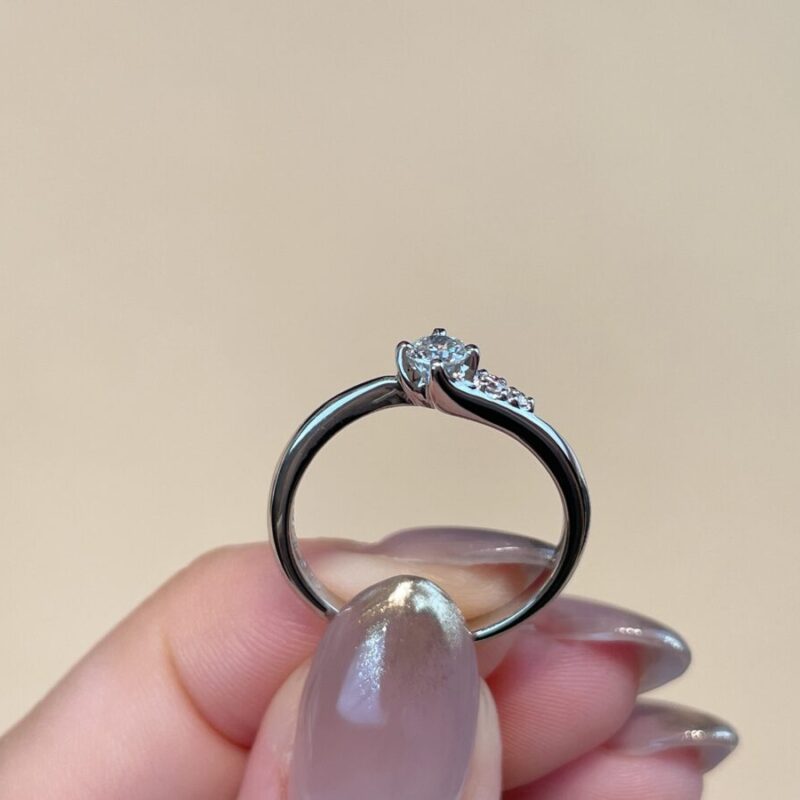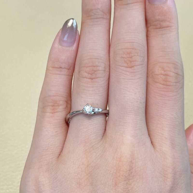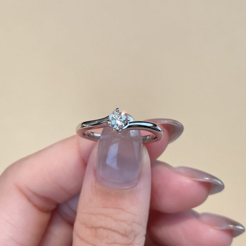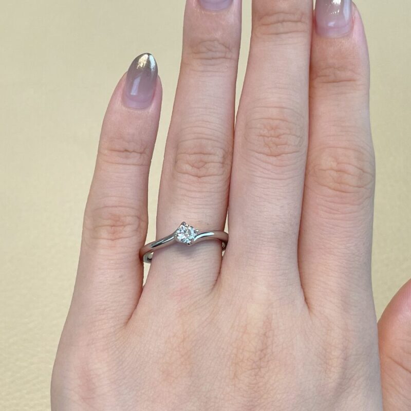 すっきりとした印象の1石ウェーブデザイン。流れるようにダイヤモンドを支えるアームのフォルムが印象的です。シンプルさの中に何かひとつこだわりを込めたい、そんな方にぴったりのデザインです。