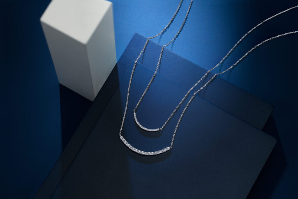 ネックレスは身につけると顔の影になりやすく、ダイヤモンドの輝きも控えめになりがち。その点ロイヤル・アッシャーのダイヤモンドであれば、わずかな光であっても跳ね返すので、胸元でキラキラと輝きます。