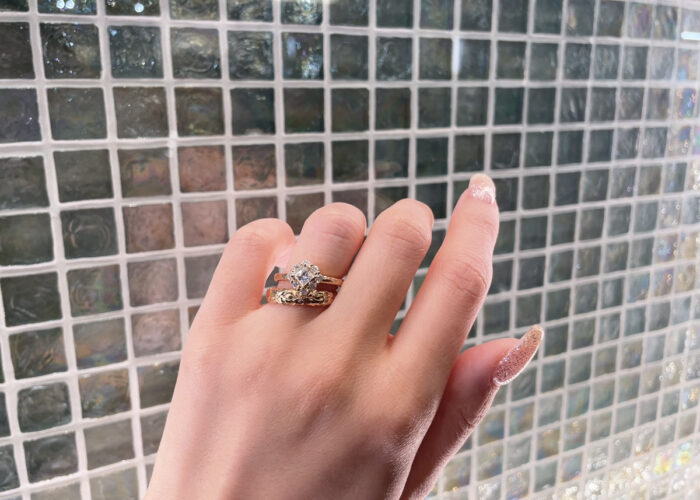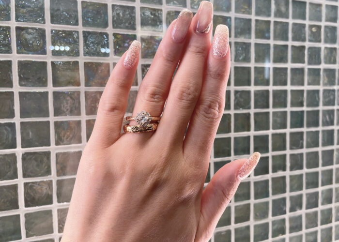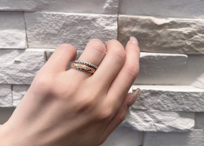 婚約指輪と結婚指輪の重ねづけなら、あれこれ考えなくても雰囲気あるコーディネートに。ある程度太めの結婚指輪だと、はっきりと彫柄が見えてハワイアンジュエリーらしさが際立ちます。