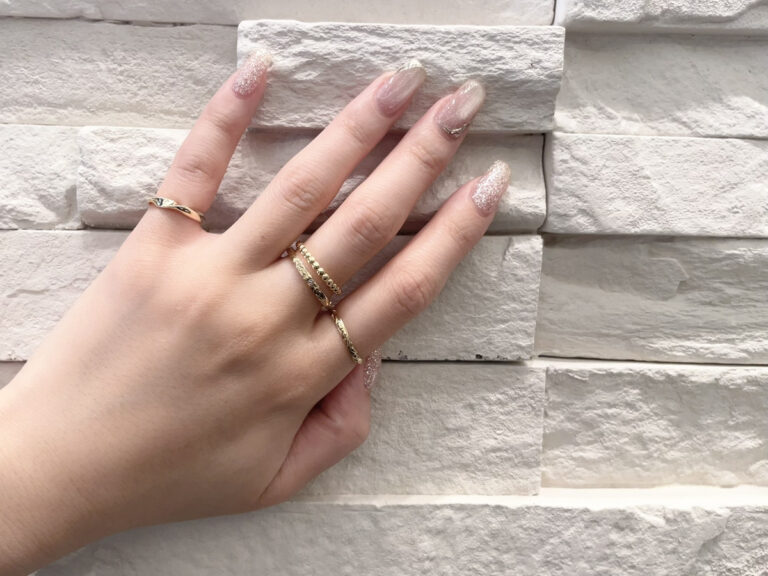 隣り合わせの指にリングをつける場合は、太さを変えたり重ねる本数を変えたり、コントラストを出すとバランスの良いコーディネートになりますよ。