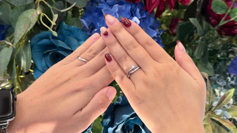 結婚指輪は「茜雲」「凛」。おふたりの手元に似合うデザインで、側面のダイヤモンドでペア感を演出。男性様もダイヤありでお作りし、輝きがとてもお似合いでした!