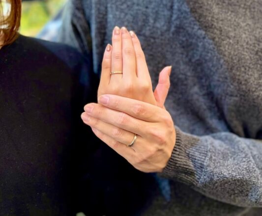個性を出しつつもシンプルさと機能美を兼ね備えた素敵な結婚指輪になりましたね。どんなお洋服でも似合い、指元を華やかにしてくれます。ご夫婦様の絆の証として末長くご愛用くださいませ。