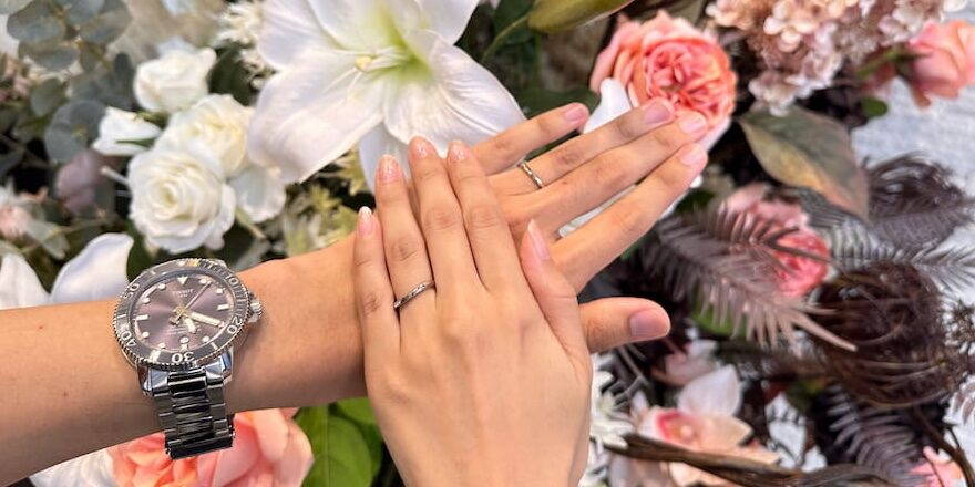 お選びいただいたのはクラウンシリーズのデザイン。流れるように斜めのラインで配されたダイヤモンドがポイントで、手を動かすたびにキラキラと輝きます。ダイヤなしタイプも中央の斜めラインがお揃いになっており、ペア感も素敵です。